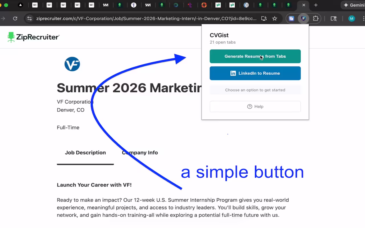 - Generate resumes for all your open job tabs - Turn 100+ job postings into tailored resumes in minutes