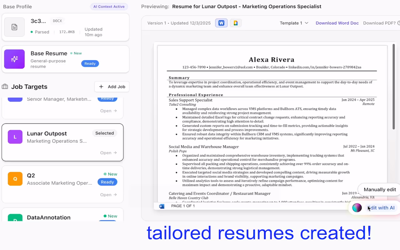 Within minutes, you have professionally tailored resumes for every job. Each resume is customized to match the specific job description, highlighting your most relevant experience and skills.